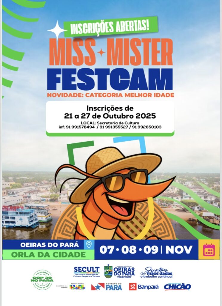 O Concurso Miss e Mister FESTCAM – 2025 será realizado pela Prefeitura Municipal de Oeiras do Pará, por meio da Secretaria Municipal de Cultura, Desporto e Turismo – SECULT, Nos dias 07, 08 e 09 de Novembro. Evento este que faz parte da Programação do 36o Festival do Camarão FESTCAM do Município de Oeiras do Pará.